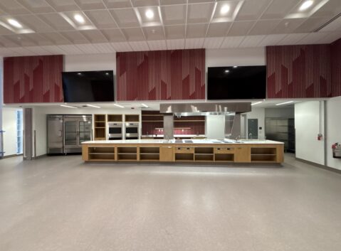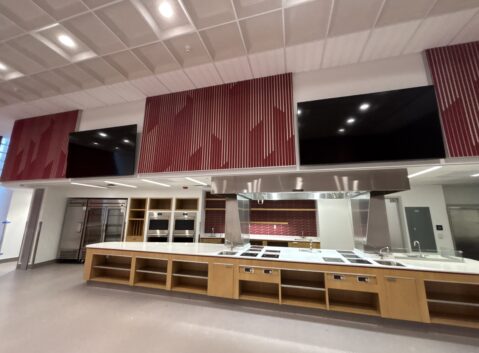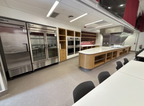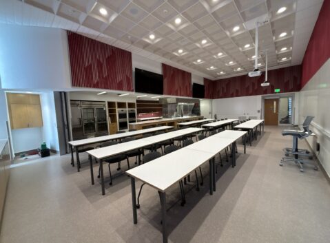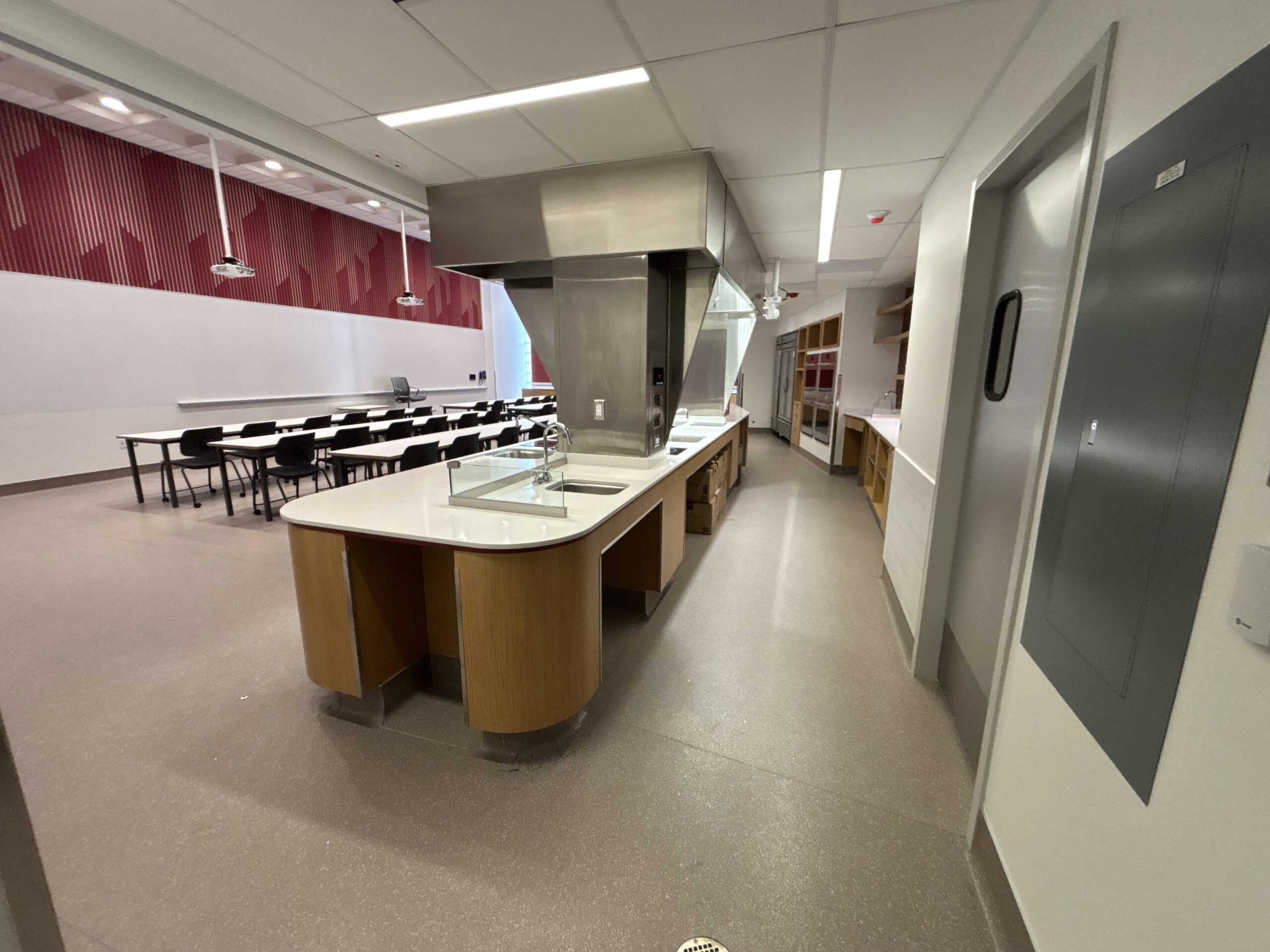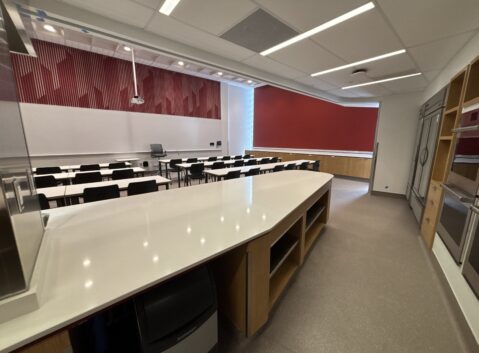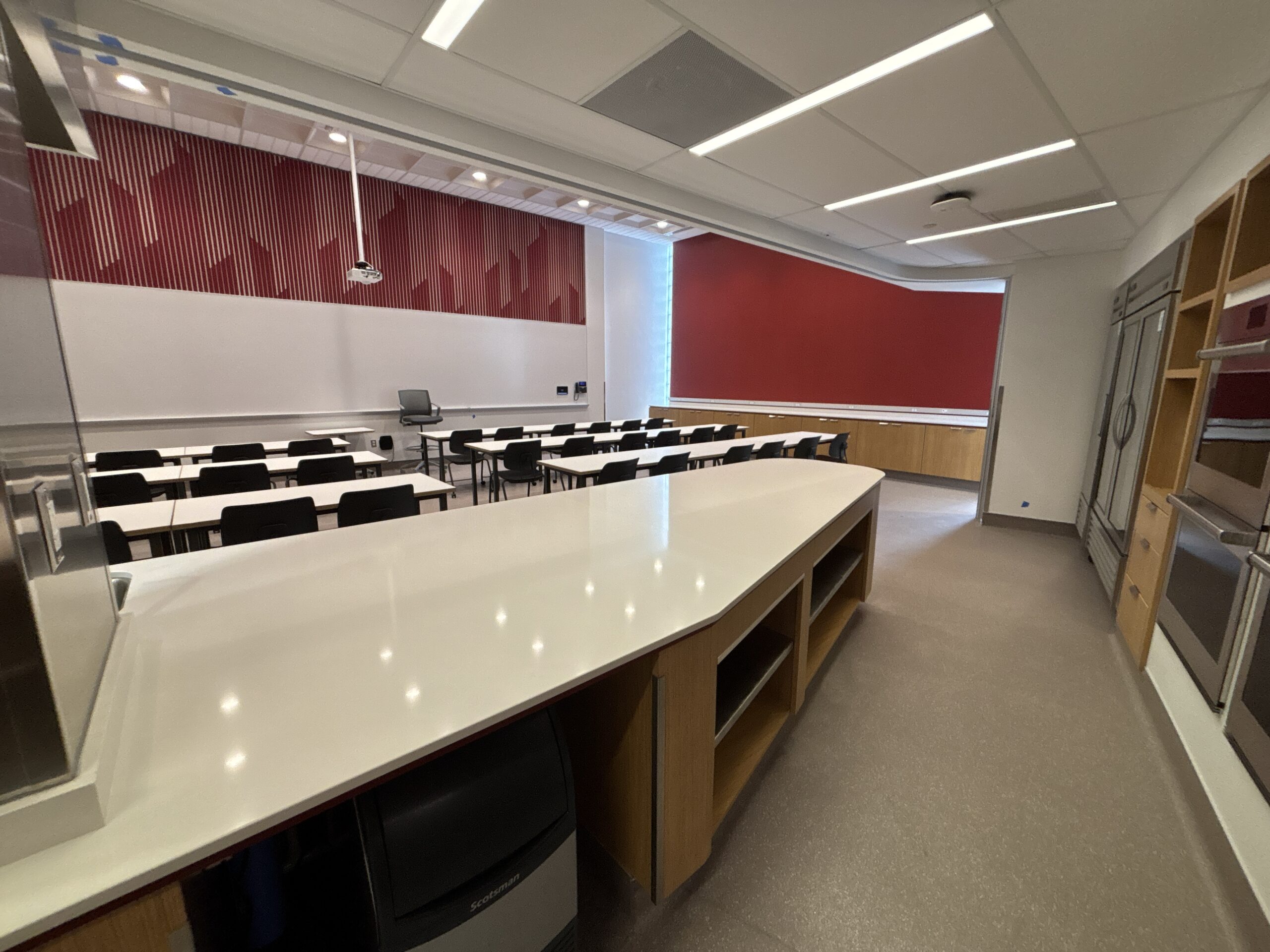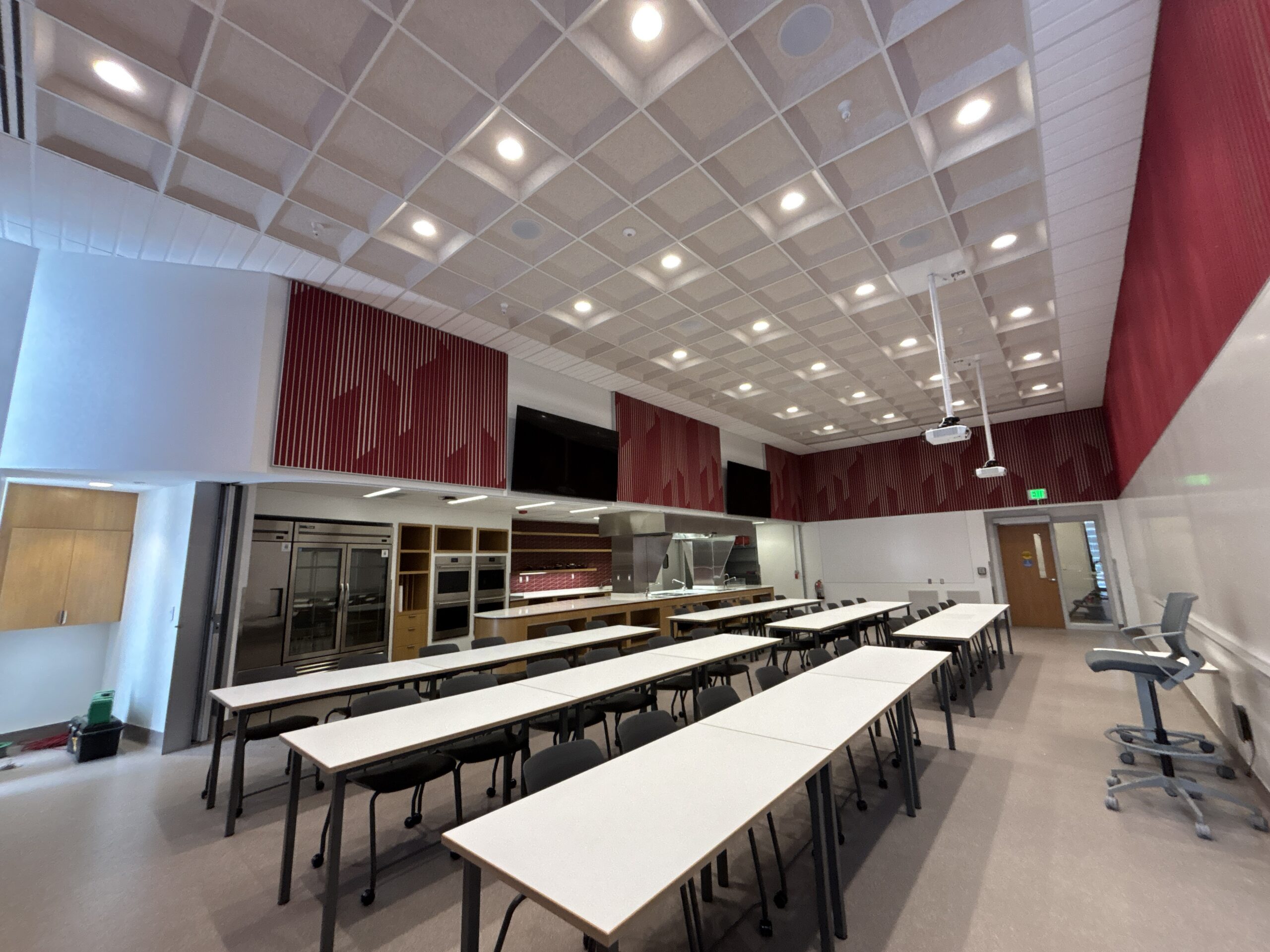A state-of-the-art projection system allows students to clearly follow live demonstrations in real time, enhancing visibility and engagement from every seat. With its flexible layout, the space easily transitions from a working kitchen to a 36-seat classroom, creating a versatile setting for lectures, demonstrations, collaborative labs, and community programming.