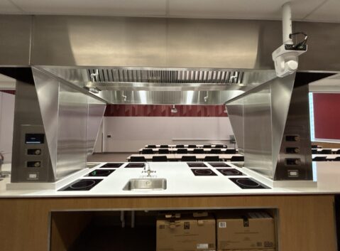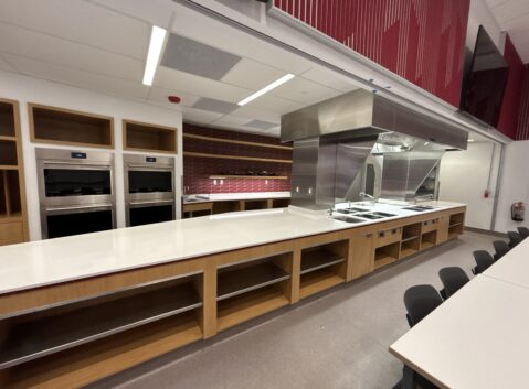 The new Nutrition Lab at Calvin University is designed as a dynamic, hands-on learning environment that bridges culinary practice with academic instruction. The lab features a fully equipped teaching kitchen complete with convection ovens, induction cooktops, commercial dishwashing equipment, dedicated prep stations, high-performance blenders and mixers, and ample pantry storage to support both individual and group work.